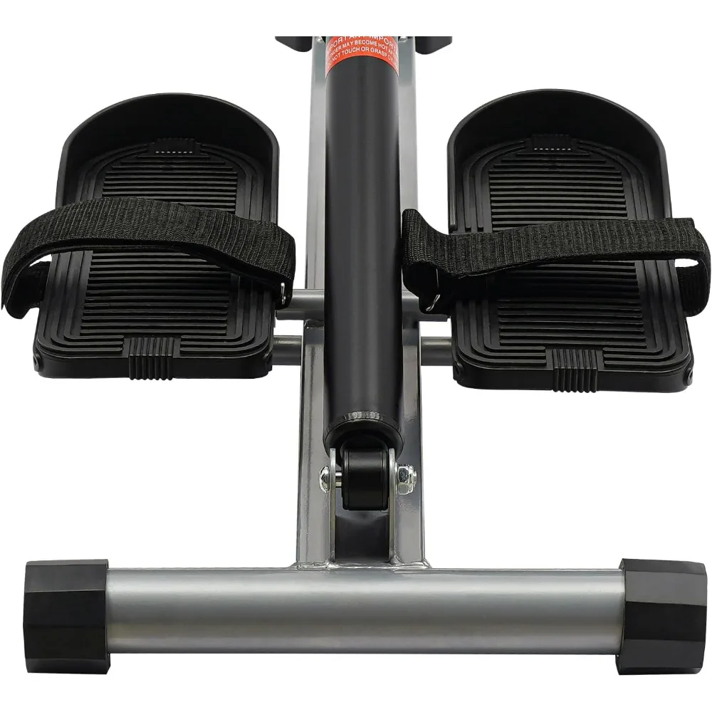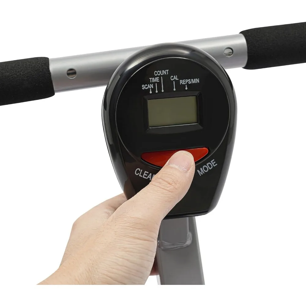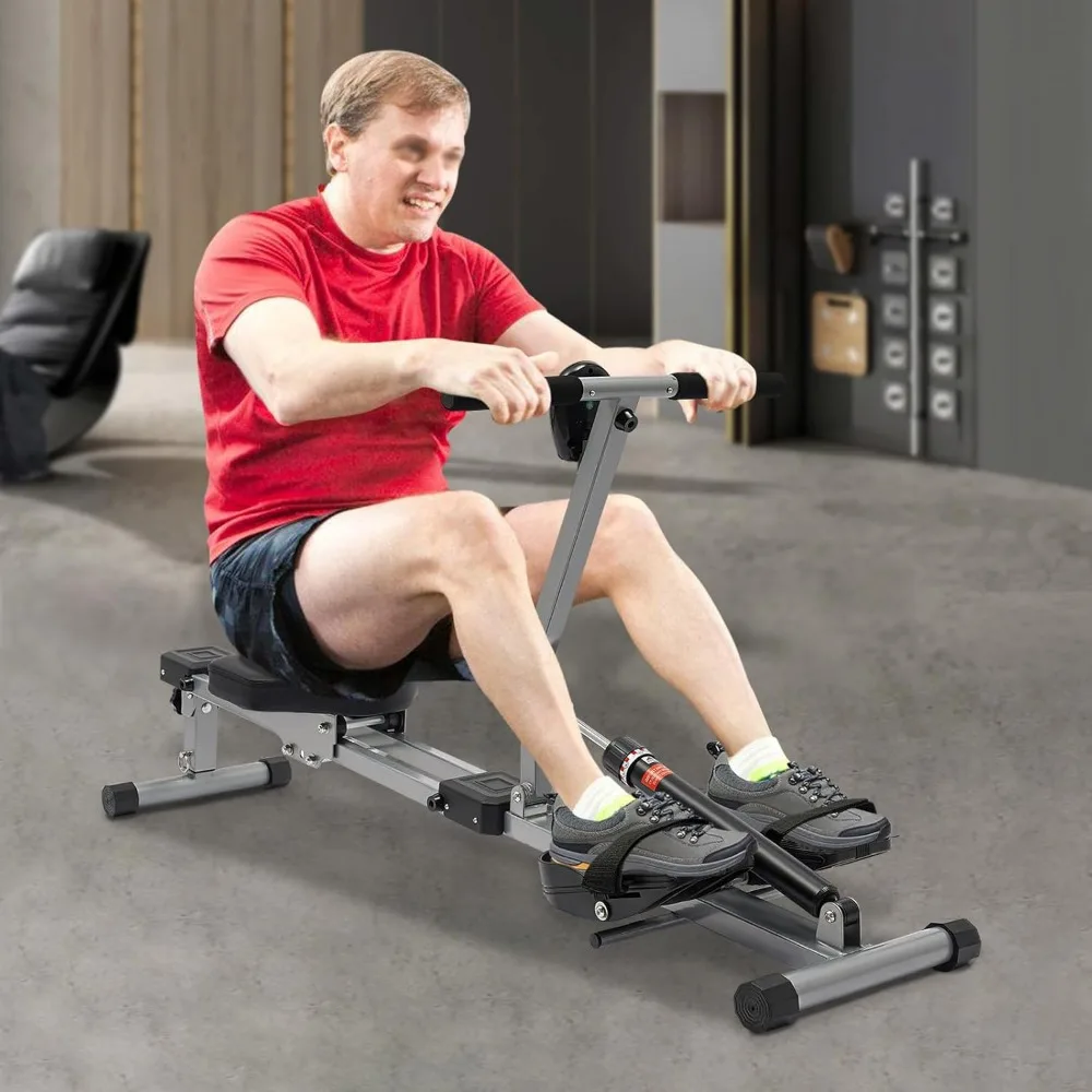 This product is crafted for durability, utilizing premium materials such as rubber, PVC, sponge, PU, and carbon steel with a baked paint finish that resists rust, corrosion, and deformation, ensuring a long-lasting performance. It boasts an impressive load-bearing capacity of 264.55 pounds, thanks to its 1.2mm thick pipes and a sturdy triangular frame, catering to the fitness needs of most adults. The rowing machine is designed with a convenient folding mechanism, allowing for easy transportation and storage, even in the smallest of spaces. It's an ideal home gym equipment that targets various muscle groups including biceps, elbow joints, thighs, abdomen, hips, and calves, enhancing overall fitness without the need for a commercial gym. Equipped with an intelligent LED meter, this machine tracks time, count, reps per minute, and calories burned, enabling users to plan and monitor their workouts effectively. It features an adjustable design with three height levels and twelve resistance levels, accommodating various training needs and family members' preferences. The thoughtful design includes adjustable pedals that align with movement for a comfortable workout angle, enhancing the exercise experience and adherence to training routines. The hydraulic cylinder is engineered with noise reduction, ensuring quiet operation even at higher resistance levels, without disrupting the household. For safe use, the product employs a dual-track slide with four embedded wheels and a PVC protective cover at the end, maintaining stability and preventing accidents. The handle and seat cushion are padded with soft sponge, and the seat surface is made of sweat-resistant PU material, providing a comfortable workout experience and reducing exercise-induced fatigue and discomfort.