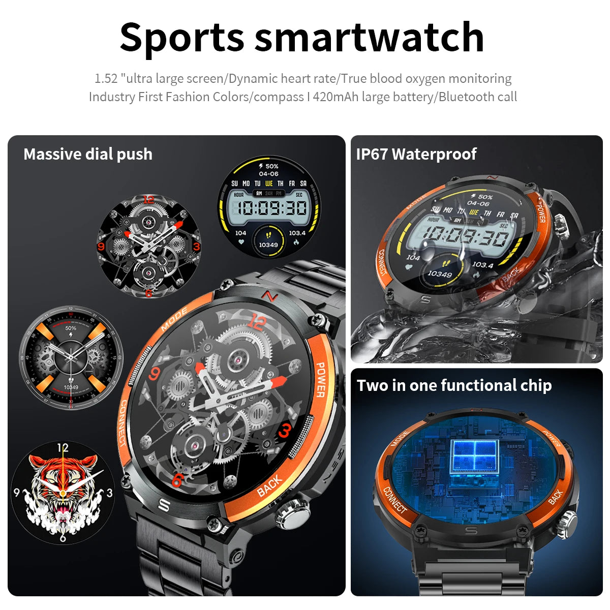 LIGE New 1.52 Inch Screen Bluetooth Call Smartwatch Men Compass Heart Rate Blood Oxygen Monitor 420MAH Long Standby Sports Watch