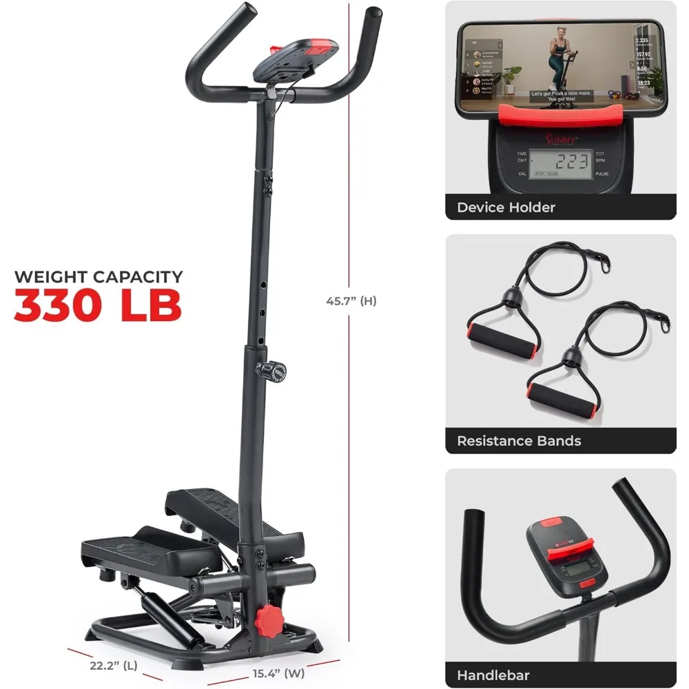 Sunny Health & Fitness Dual-Purpose Smart Stepper with Handlebar and Resistance Bands for Home Total Body Workouts